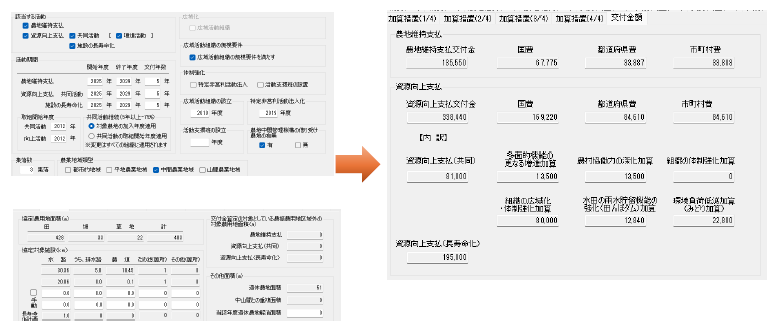 活動組織内の農地情報を集計し、システムが自動的に計算を行い交付金額が集計されます。